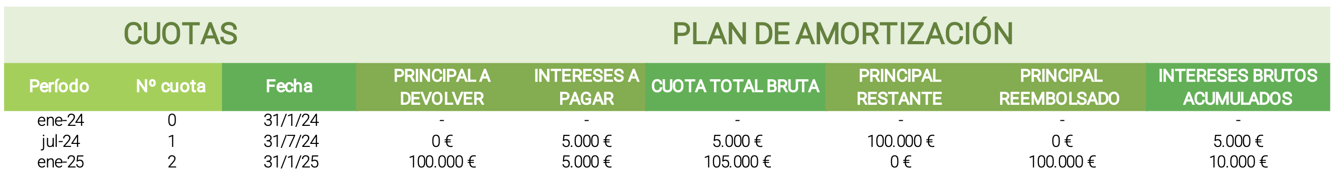 El préstamo consta de una cuota semestral de 5.000 Euros y una cuota final de 105.000 Euros.