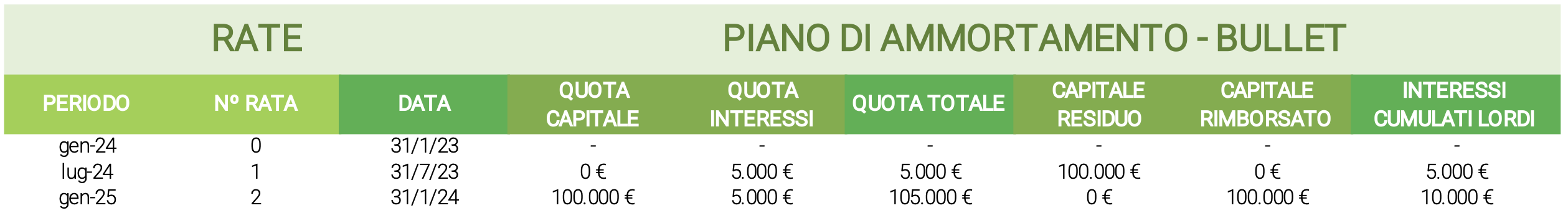 Il prestito consiste in una rata semestrale di 5.000 euro e in una rata finale di 105.000 euro.